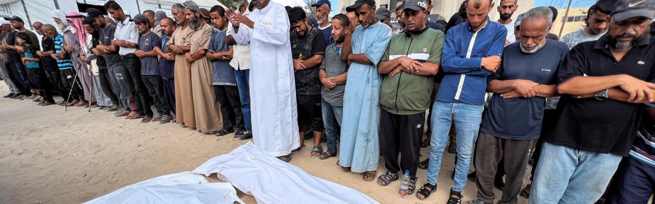 Des personnes en deuil prient pendant les funérailles de Palestiniens tués par des tirs israéliens alors qu’ils cherchaient de l’aide, selon des médecins, à l’hôpital Nasser de Khan Younis, dans le sud de la bande de Gaza, le 19 juillet 2025. © Hussam Al-Masri, Reuters