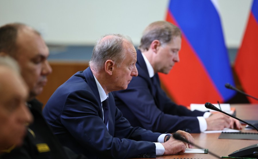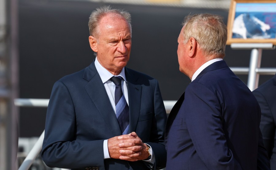 Aide présidentielle Nikolai Patrushev et présidente du conseil d’administration de la United Shipbuilding Corporation (USC), PDG de la banque VTB Andrei Kostin avant la cérémonie d’élévation du drapeau sur le croiseur à propulsion nucléaire de Knyaz Pozharsky.