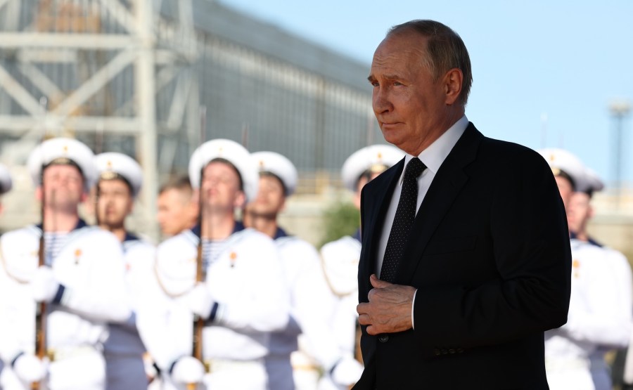 Vladimir Poutine a participé à la cérémonie de lever du drapeau naval sur le croiseur sous-marin nucléaire Knyaz Pojarski, qui entre en service dans la Marine, à l’usine Sevmash de Severodvinsk.