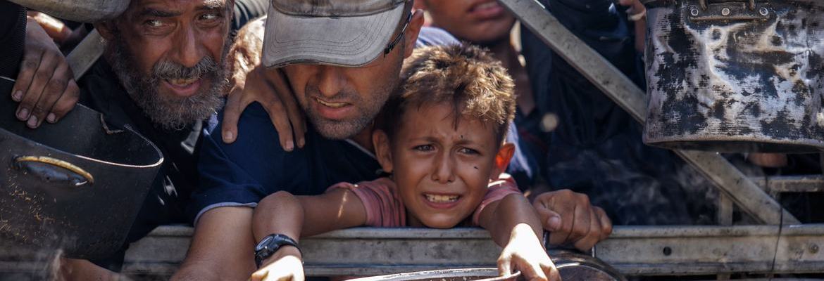 © UNICEF/Mohammed Nateel – Des habitants de Gaza attendent de la nourriture dans un centre d’aide humanitaire.