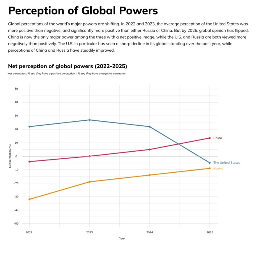 Mais nous vivons dans un monde où, selon un récent sondage menée auprès de 111.273 personnes dans 100 pays par la Fondation Alliance of Democracies, la perception des États-Unis est en chute libre tandis que la perception de la Chine, en particulier dans les pays du Sud, augmente continuellement depuis des années et a maintenant dépassé les États-Unis.