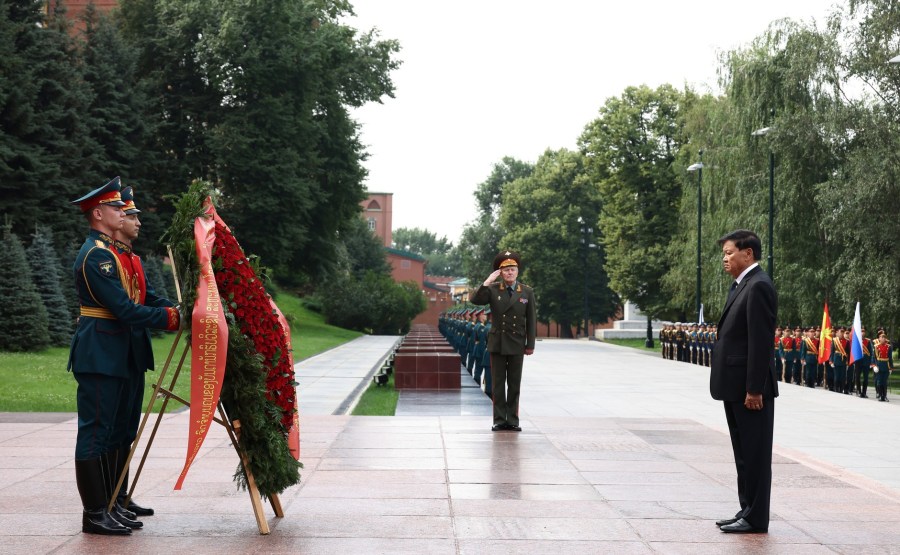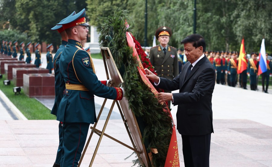 Dans le cadre de sa visite officielle en Russie, le président du Laos Thongloun Sisoulith a posé des fleurs sur le tombeau du soldat inconnu du Garden Alexander à Moscou. Photo: Artem Geodakyan, Ria Novosti