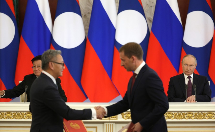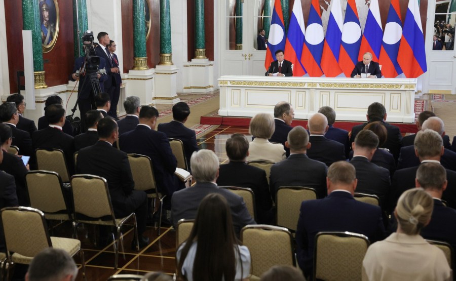 Une cérémonie pour échanger des documents signés lors de la visite officielle du président du Laos en Russie. Photo: Vladimir Gerdo, Tass