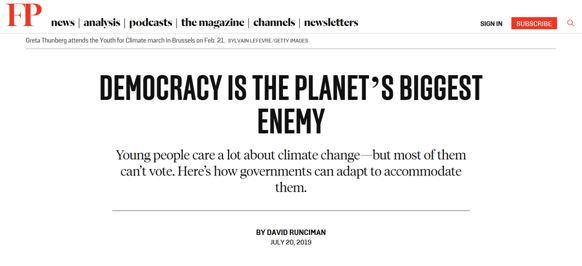 En réalité, le jeunisme est une fois de plus la version idéologique de l’authentique rajeunissement de la politique souhaité. Ces jeunes sont-ils des acteurs réels d’un projet bien pensé à l’élaboration duquel ils ont participé ? ou les icônes d’un autre projet projeté par une autre génération, de plus en plus illégitime celle-ci ? Pour notre part, nous avons tendance à voir encore la main décharnée de la génération babyboomer derrière les visions de fin du monde véhiculées par une génération en fin de course.