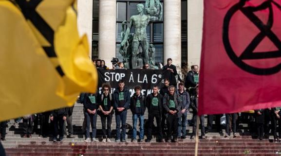 Figure 3 – Des membres d’Extinction Rebellion versent du faux sang sur les marches du Trocadéro à Paris – Source : France Info