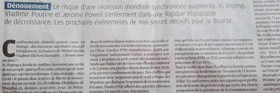 Que le risque d’une récession mondiale synchronisée augmente. …/…… Lire la suite 4933 – Charles Sannat… Risque de Récession Mondiale dûe au conflit Ukrainien… Pénurie de Blé en Inde – d’essence au Sri lanka… les USA devant une récession – 17.05.2022
